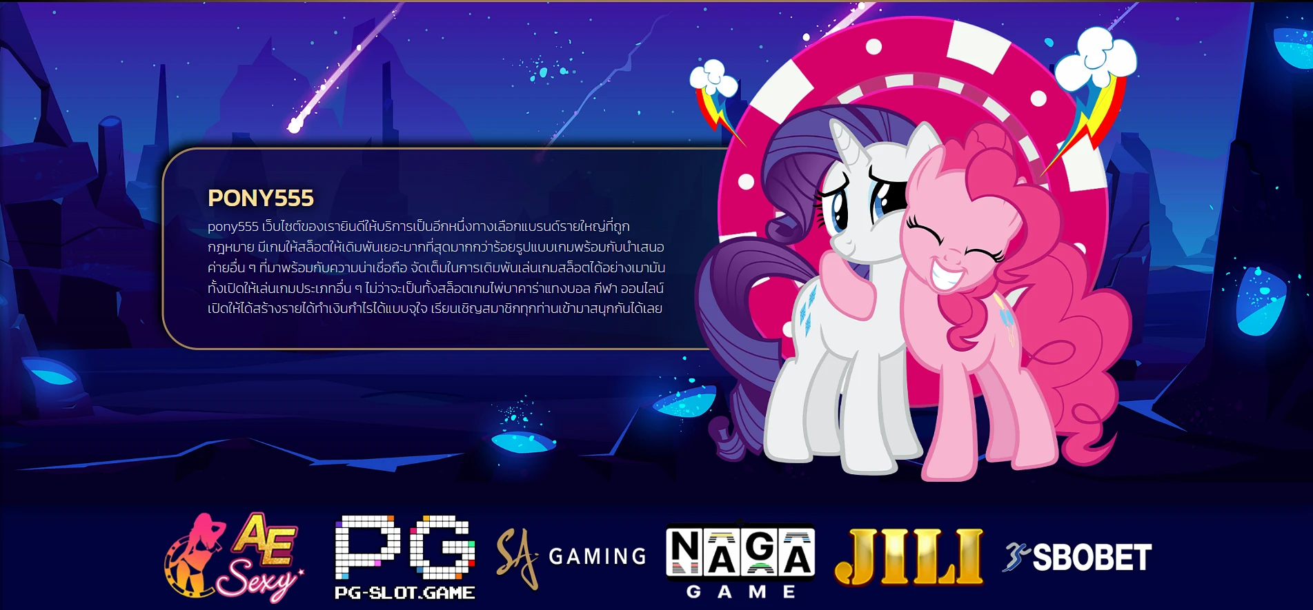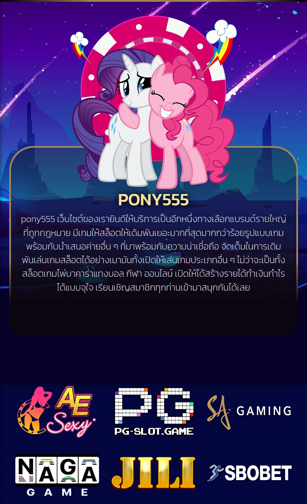 แพลตฟอร์มPONY555 คืออีกหนึ่งชื่อที่นักเดิมพันออนไลน์พูดถึงมากที่สุดในขณะนี้ เพราะที่นี่ได้รวบรวมเกมสล็อตออนไลน์ยอดนิยมจากค่าย PG Slot ค่ายเกมระดับแนวหน้าที่ขึ้นชื่อเรื่องความบันเทิงและโบนัสแตกไวที่สุดแห่งปี การเข้ามาเล่นที่PONY555 คุณจะได้พบกับเกมสล็อตที่หลากหลาย ทั้งเกมยอดฮิตและเกมใหม่ล่าสุดที่อัปเดตทุกสัปดาห์